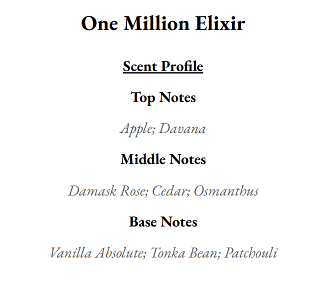 Paco Rabanne 1 Million Elixir is a rich, bold, and intensely sweet fragrance that reimagines the original’s flamboyance with amped-up depth and sophistication. It opens with juicy apple and herbal davana, delivering a vibrant and slightly boozy fruitiness. The heart is a luscious bouquet of Damask rose and osmanthus, balanced by cedarwood, which adds structure and a refined floral-woody edge. As the scent dries down, an irresistible blend of vanilla absolute, creamy tonka bean, and earthy patchouli emerges, creating a warm, gourmand base that lingers on the skin.